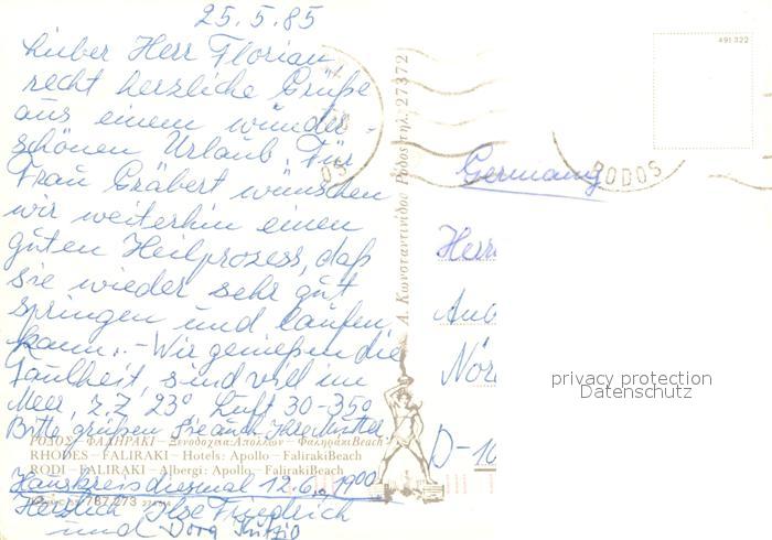 old postcard Rhodos Rhodes aegaeis Hotel Apollo Faliraki Beach Hotel postalisch gelaufen Erhaltung siehe scans [KathaD81]