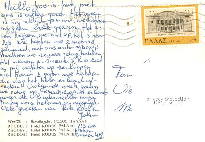 old postcard Rhodos Rhodes aegaeis Hotel Rhodos Palace postalisch gelaufen Erhaltung siehe scans [WerneD78]