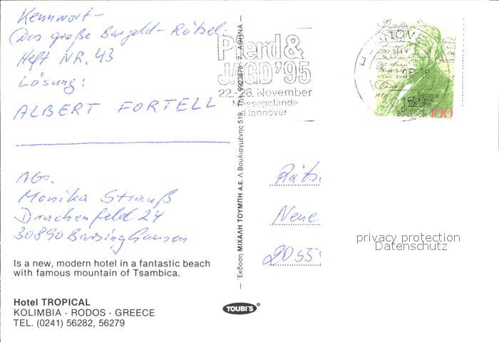 old postcard Rhodos Rhodes aegaeis Hotel Tropical Kolimbia postalisch gelaufen Erhaltung siehe scans
