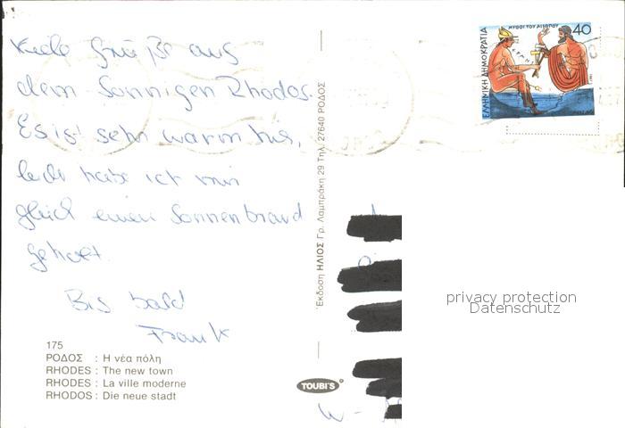 old postcard Rhodos Rhodes aegaeis Neue Stadt postalisch gelaufen Erhaltung siehe scans