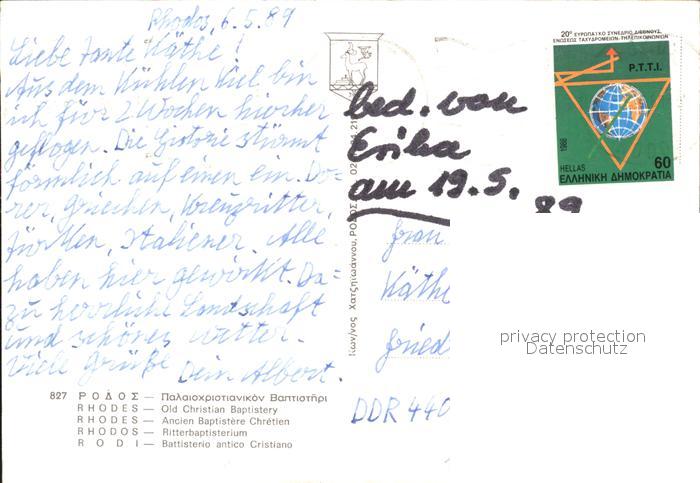 old postcard Rhodos Rhodes aegaeis Ritterbaptisterium postalisch gelaufen Erhaltung siehe scans