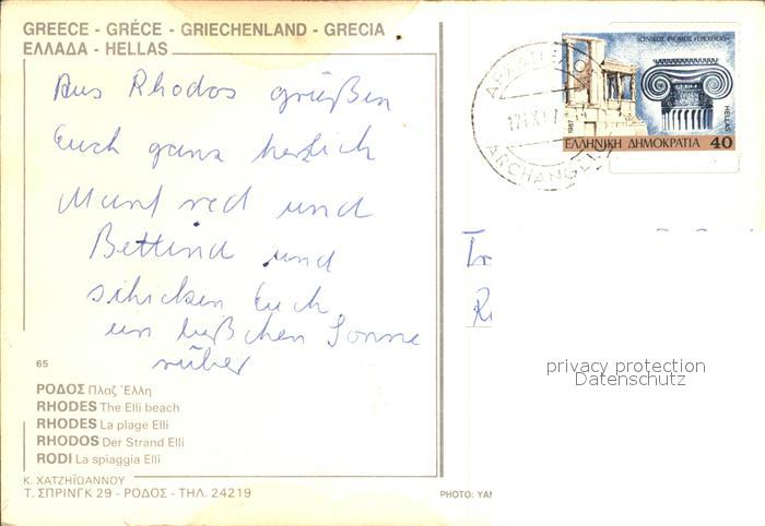 old postcard Rhodos Rhodes aegaeis Strand Elli postalisch gelaufen Erhaltung siehe scans