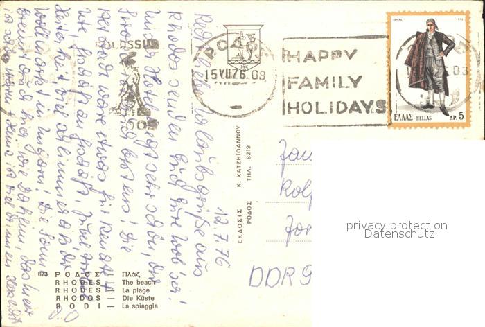 old postcard Rhodos Rhodes aegaeis Strand Promedade postalisch gelaufen Erhaltung siehe scans
