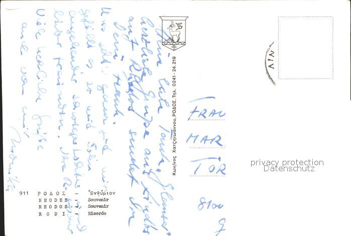 old postcard Rhodos Rhodes aegaeis Strand Statue Elafos Tempel Ruine Antike postalisch gelaufen Erhaltung siehe scans
