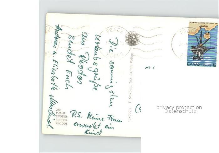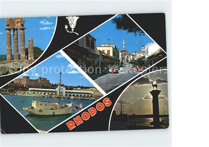 old postcard Rhodos Rhodes aegaeis Tempel Ruine Hafeneinfahrt Festung Statue Elafos postalisch gelaufen Erhaltung siehe scans