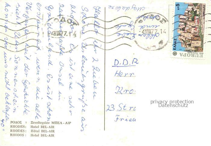 74086692 old postcard RHODOS Rhodes Greece Hotel Bel Air postalisch gelaufen Erhaltung siehe scans [WerneD78] KatCode: 11190