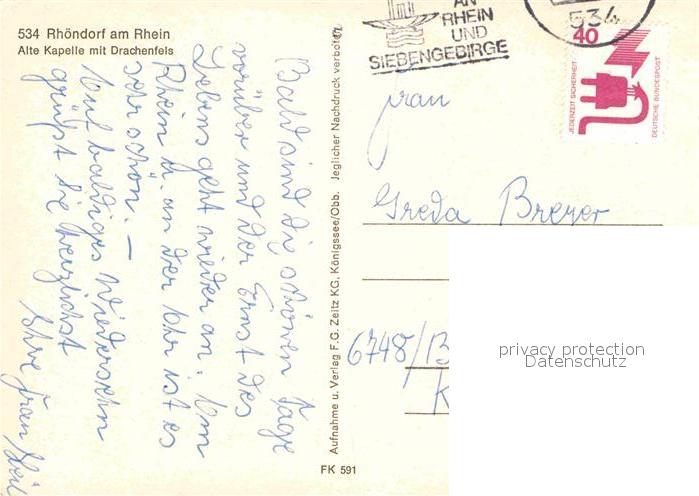 72770984 alte Postkarte Rhoendorf Alte Kapelle Drachenfels postalisch gelaufen Erhaltung siehe scans [NatalD47] KatCode: 11110005382008
