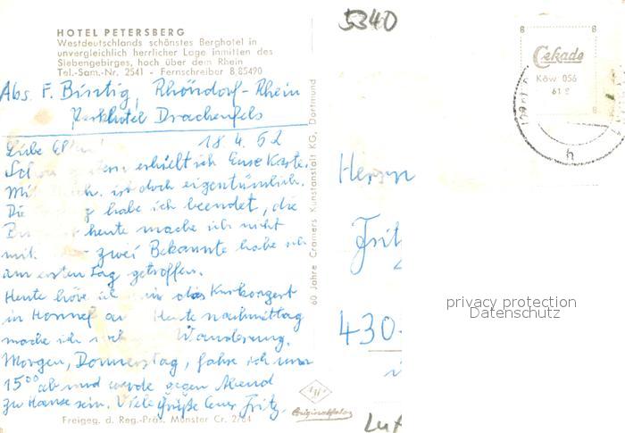 73694236 alte Postkarte Rhoendorf Hotel Petersberg Siebengebirge postalisch gelaufen Erhaltung siehe scans [LiesaD40] KatCode: 11110005382008
