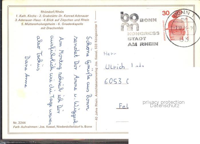 72126291 alte Postkarte Rhoendorf Kirche Adenauer Grabstaette Haus Ziepchen Rhein Muettererholungsheim Gnadenkapelle Drachenfels postalisch gelaufen Erhaltung siehe scans KatCode: 11110005382008