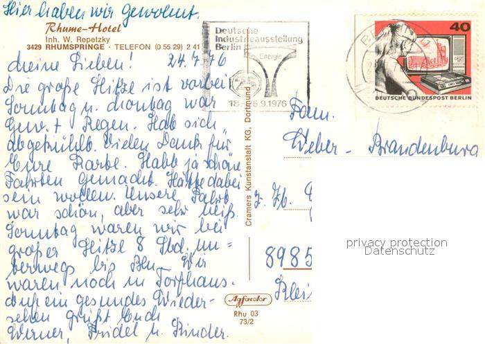 73718450 alte Postkarte Rhumspringe Rhume Hotel Gastraeume Terrasse postalisch gelaufen Erhaltung siehe scans [WerneD78] KatCode: 11110003152019