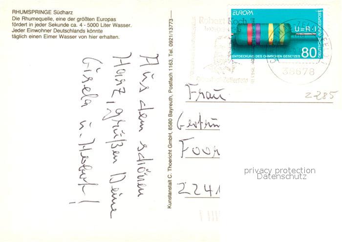 73129444 alte Postkarte Rhumspringe Rhumesprung Franz Gleitze postalisch gelaufen Erhaltung siehe scans [PaolaD17] KatCode: 11110003152019
