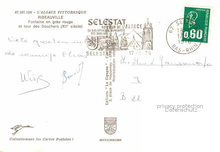 12687302 carte postale Ribeauville Haut Rhin Elsass Fontaine en gres rouge Tour des Bouchers XII siecle Costumes Brunnen Turm Trachten postalisch gelaufen Erhaltung siehe scans [FriedD77] KatCode: 11170068568269