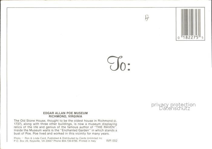 72271778 Richmond Virginia Edgar Allan Poe Museum postalisch nicht gelaufen Erhaltung siehe scans KatCode: 14140490000000