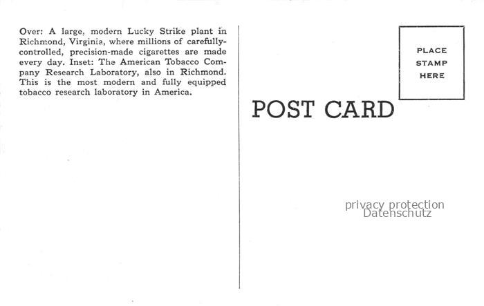 34144327 Richmond Virginia USA The American Tobacco Company Research Laboratory Lucky Strike plant postalisch nicht gelaufen Erhaltung siehe scans [WerneD78] KatCode: 14140490000000