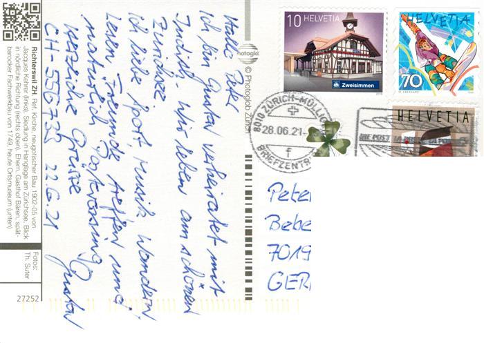 13904304 alte Postkarte Richterswil ZH Ref Kirche Siedlung am Zuerichsee Ehem Gasthof Baeren heute Ortsmuseum postalisch gelaufen Erhaltung siehe scans [FriedD77] KatCode: 11470260890336