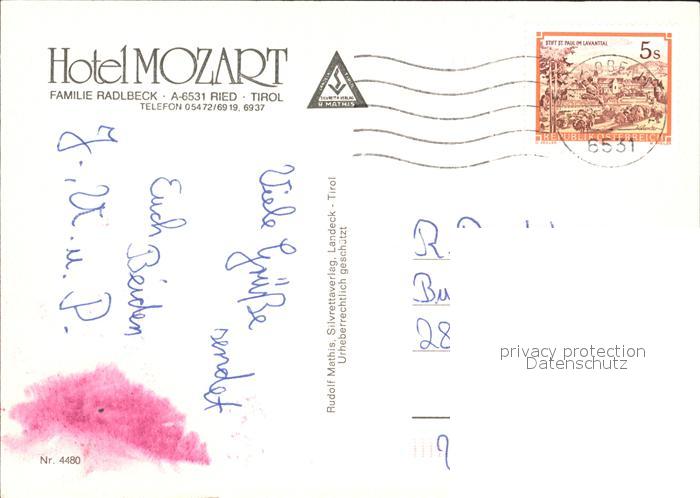 72074443 alte Postkarte Ried Oberinntal Hotel Mozart postalisch gelaufen Erhaltung siehe scans KatCode: 11390334070620