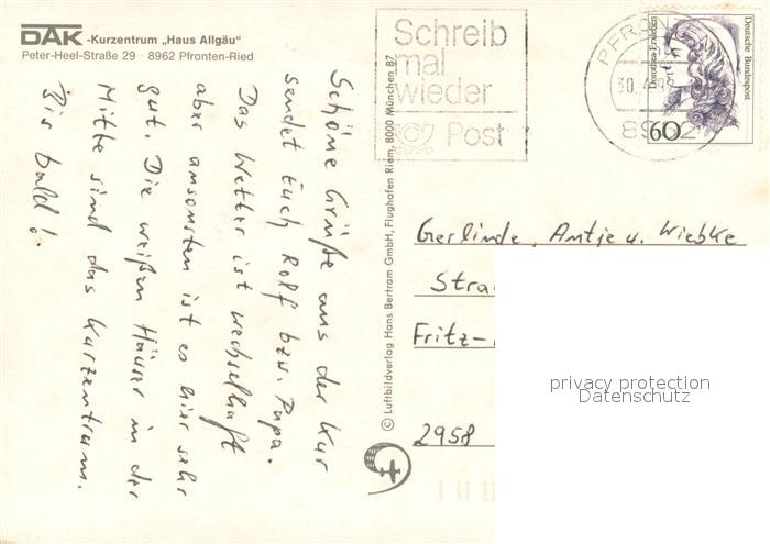73720235 alte Postkarte Ried Pfronten DAK Kurzentrum Haus Allgaeu Fliegeraufnahme postalisch gelaufen Erhaltung siehe scans [WerneD78] KatCode: 11110009777159