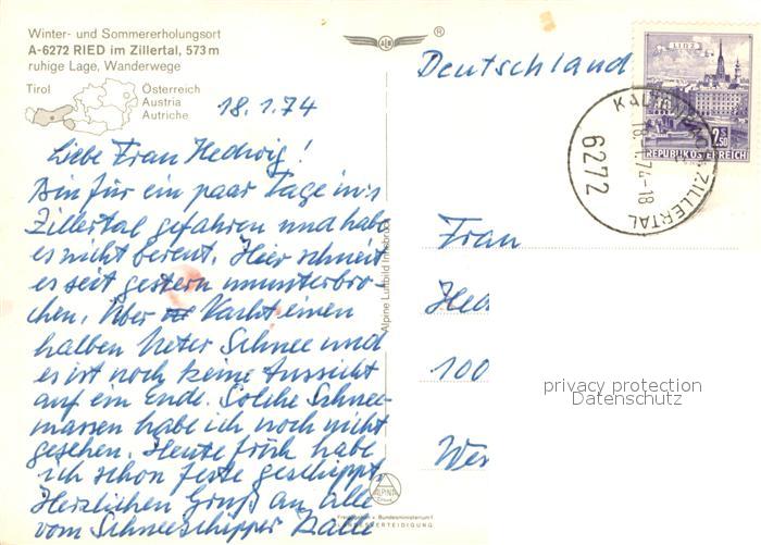73644489 alte Postkarte Ried Zillertal Erholungsort Fliegeraufnahme postalisch gelaufen Erhaltung siehe scans [FriedD77] KatCode: 11390335070923