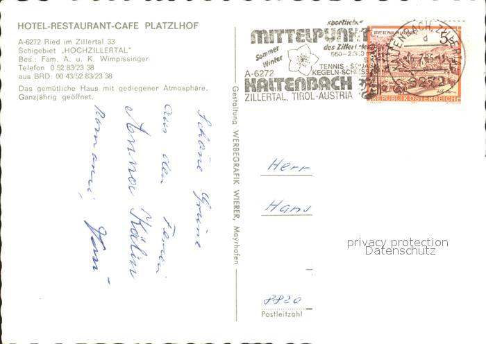 72279615 alte Postkarte Ried Zillertal Hotel Platzlhof postalisch gelaufen Erhaltung siehe scans KatCode: 11390335070923
