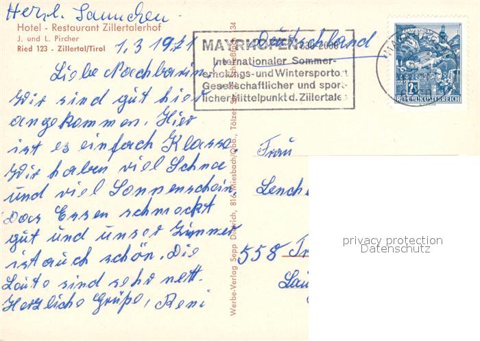 12974556 alte Postkarte Ried Zillertal Hotel Zillertalerhof postalisch gelaufen Erhaltung siehe scans [NatalD47] KatCode: 11390335070923