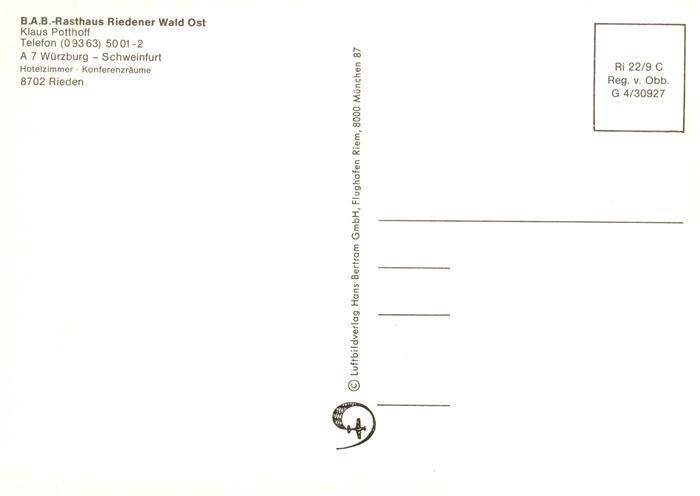 73946681 Rieden Unterfranken BAB Rasthaus Riedener Wald Ost postalisch nicht gelaufen Fliegeraufnahme Erhaltung siehe scans [FriedD77] KatCode: 11110009679143