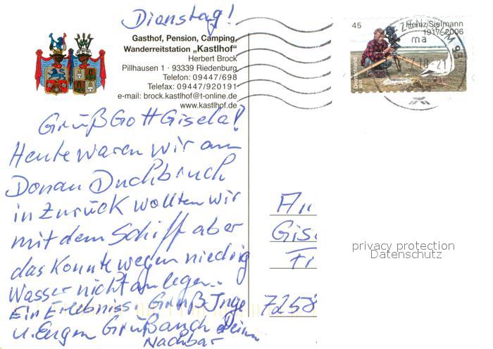 73664765 alte Postkarte Riedenburg Altmuehltal Gasthof Pension Kastlhof Camping Wanderreitstation Fliegeraufnahme postalisch gelaufen Erhaltung siehe scans [WerneD78] KatCode: 11110009273164