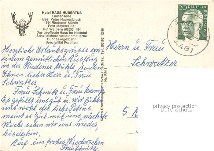 73719519 alte Postkarte Riedener Muehlen Hotel Haus Hubertus Garten postalisch gelaufen Erhaltung siehe scans [FriedD77] KatCode: 11110007137093