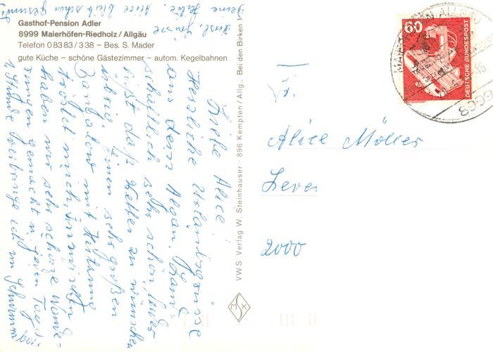 73896982 alte Postkarte Riedholz Allgaeu Gasthof Pension Adler Gaststube Kegelbahn postalisch gelaufen Erhaltung siehe scans [FriedD77] KatCode: 11110009776118