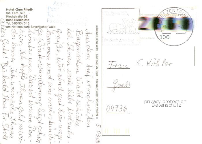 73836025 alte Postkarte Riedlhuette Hotel zum Friedl Nationalpark Bayerischer Wald im Winter postalisch gelaufen Erhaltung siehe scans [FriedD77] KatCode: 11110009272143