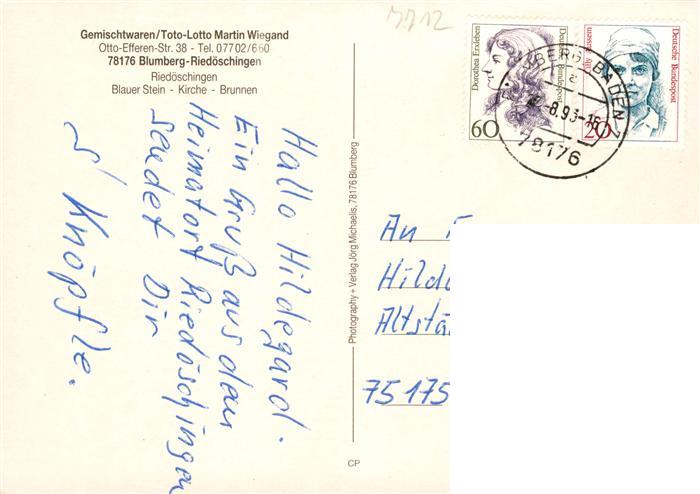 73926942 alte Postkarte Riedoeschingen Panorama Blauer Stein Kirche Brunnen postalisch gelaufen Erhaltung siehe scans [FriedD77] KatCode: 11110008326005