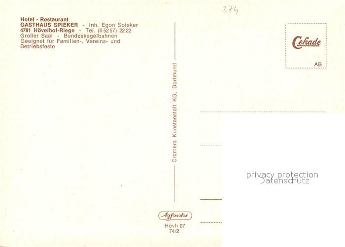 73570024 Riege Hoevelhof Hotel Restaurant Gasthaus Spieker postalisch nicht gelaufen Erhaltung siehe scans [FriedD77] KatCode: 11110005774024