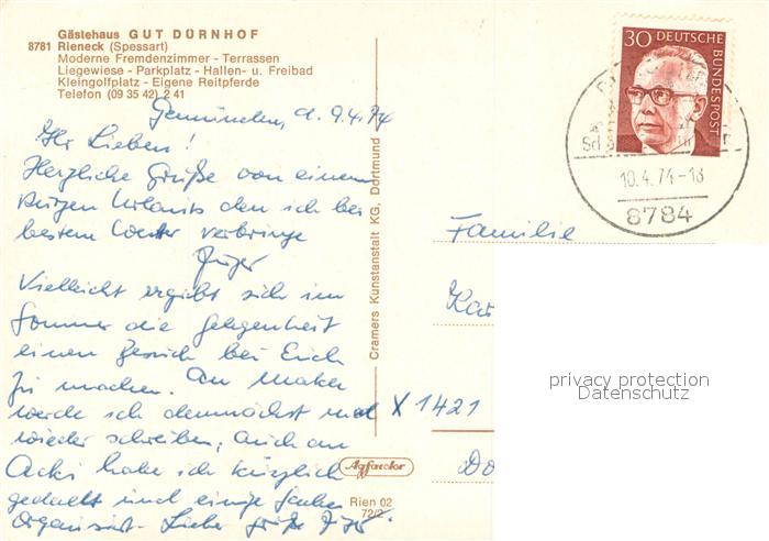 73707688 alte Postkarte Rieneck Gaestehaus Gut Duernhof Schwimmbad Pferdekoppel Angeln Minigolf Spielplatz Reiten postalisch gelaufen Erhaltung siehe scans [WerneD78] KatCode: 11110009677177
