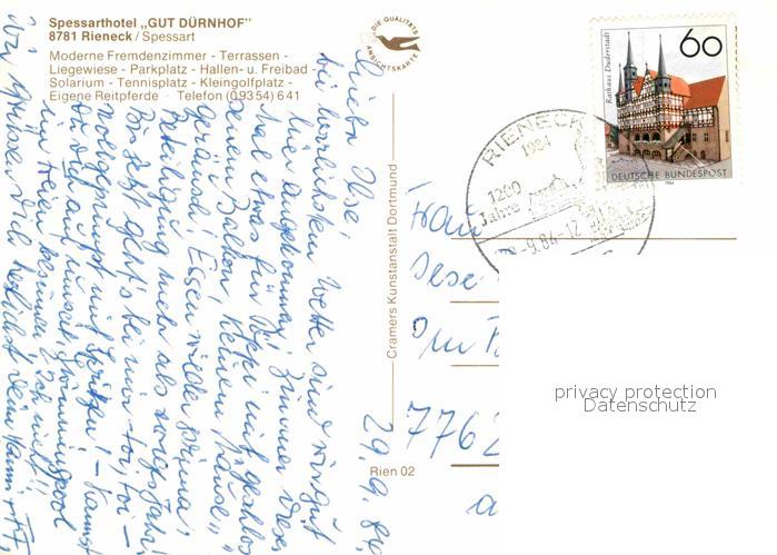 72769678 alte Postkarte Rieneck Spessarthotel Gut Duernhof Frei und Hallenbad Reiten Angeln postalisch gelaufen Erhaltung siehe scans [WerneD78] KatCode: 11110009677177