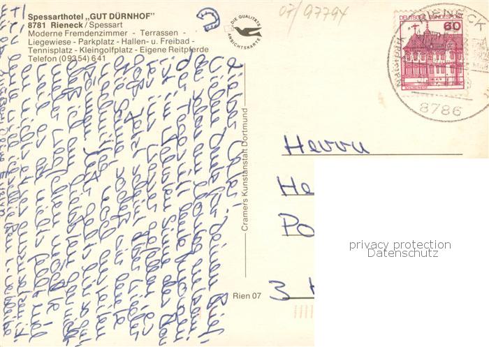 73760706 alte Postkarte Rieneck Spessarthotel Gut Duernhof Hallenbad postalisch gelaufen Erhaltung siehe scans [FriedD77] KatCode: 11110009677177