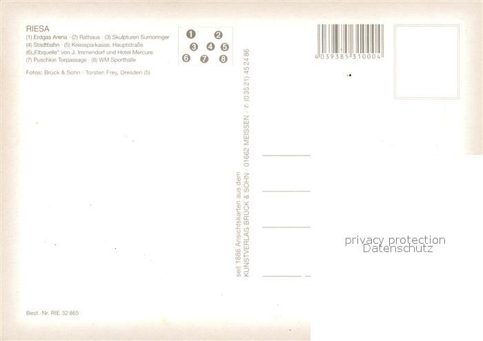 73182399 Riesa Sachsen Erdgas Arena Rathaus Skulpturen Stadtbahn Sparkasse Elbquelle Hotel Mercure Puschkin Torpassage WM Sporthalle postalisch nicht gelaufen Erhaltung siehe scans [FriedD77] KatCode: 11110014285250