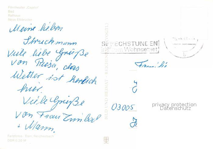 72688075 alte Postkarte Riesa Sachsen Filmtheater Capitol Freibad Rathaus Neue Elbbruecke postalisch gelaufen Erhaltung siehe scans [FriedD77] KatCode: 11110014285250