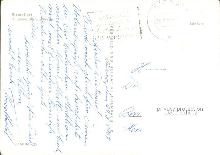 72064264 alte Postkarte Riesa Sachsen Klubhaus der Stahlwerker Joliot Curie Haus postalisch gelaufen Erhaltung siehe scans KatCode: 11110014285250