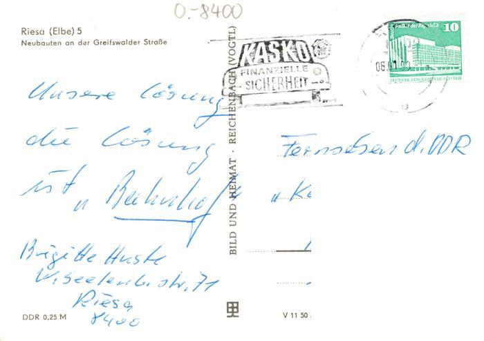 73891001 alte Postkarte Riesa Sachsen Neubauten an der Greifswalder Strasse Springbrunnen postalisch gelaufen Erhaltung siehe scans [FriedD77] KatCode: 11110014285250