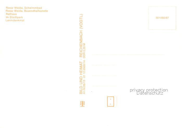 73302430 Riesa Sachsen Rathaus Stadtpark Lenindenkmal Weida Schwimmbad Bushaltestelle postalisch nicht gelaufen Erhaltung siehe scans [FriedD77] KatCode: 11110014285250