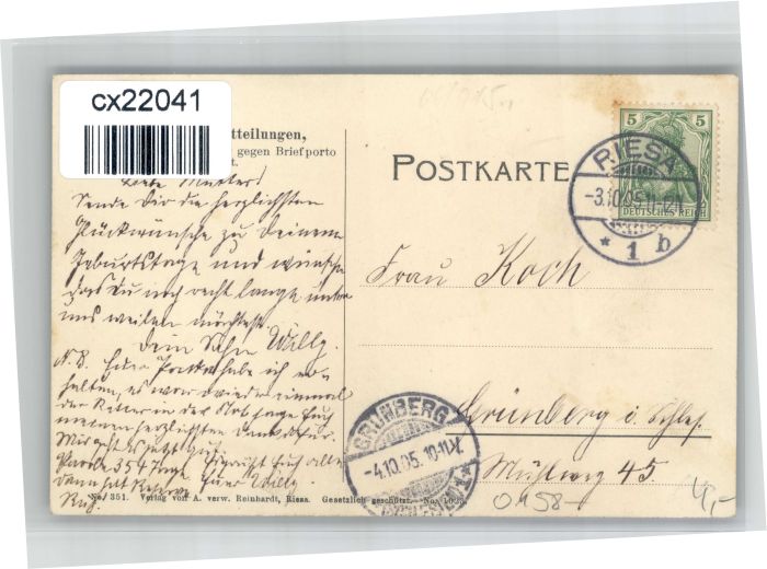 30740128 alte Postkarte Riesa Sachsen Riesa Wettinerstrasse Faehre Rathaus Kloster Kirche Kaiser Wilhelm Platz postalisch gelaufen KatCode: 11110014285250