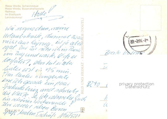 73145081 alte Postkarte Riesa Sachsen Schwimmbad Busendhaltestelle Rathaus Stadtpark Lenindenkmal postalisch gelaufen Erhaltung siehe scans [FriedD77] KatCode: 11110014285250