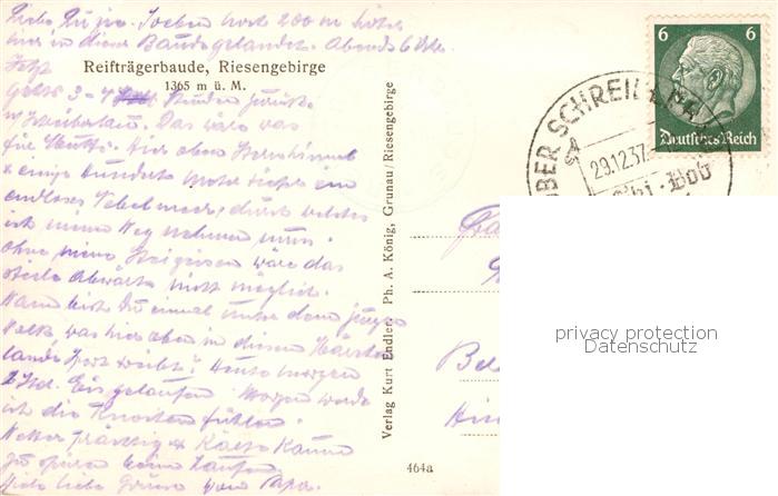 old postcard Riesengebirge Krkonose Karkonosze Reiftraegerbaude postalisch gelaufen Erhaltung siehe scans [WerneD78]