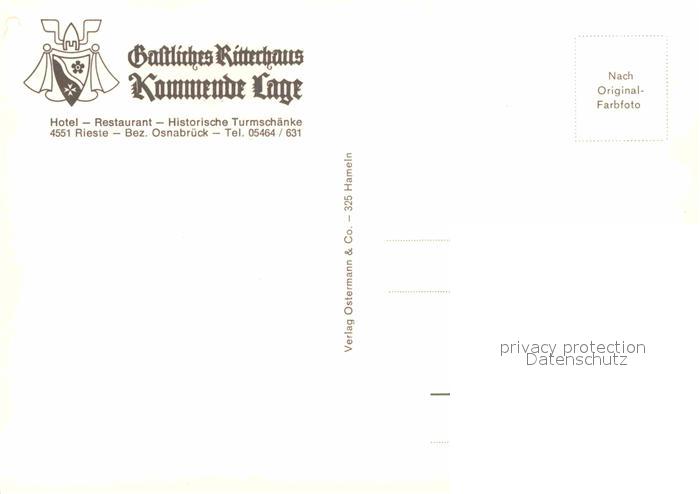 72915170 Rieste Osnabrueck Hotel Restaurant Historische Turmschaenke Ritterhaus Kommende Lage postalisch nicht gelaufen Erhaltung siehe scans [LiesaD40] KatCode: 11110003459031