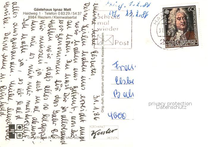 12945902 alte Postkarte Riezlern Kleinwalsertal Vorarlberg Gaestehaus Matt postalisch gelaufen Erhaltung siehe scans [NatalD47] KatCode: 11390