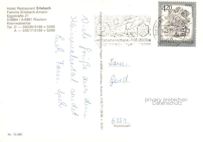 73198162 alte Postkarte Riezlern Kleinwalsertal Vorarlberg Hotel Restaurant Erlebach postalisch gelaufen Erhaltung siehe scans [KathaD81] KatCode: 11390