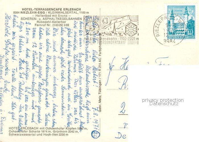 73779665 alte Postkarte Riezlern Kleinwalsertal Vorarlberg Hotel Terrassencafe Erlebach postalisch gelaufen Erhaltung siehe scans [WerneD78] KatCode: 11390