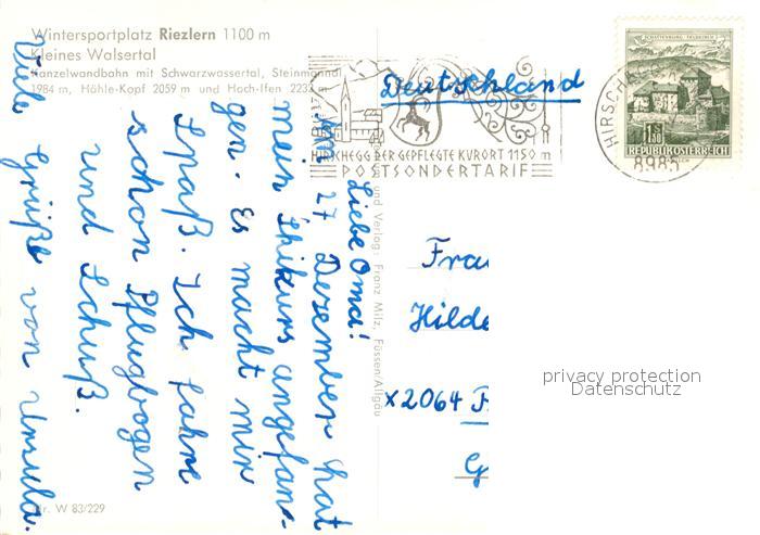 73516640 alte Postkarte Riezlern Kleinwalsertal Vorarlberg Kanzelwandbahn mit Schwarzwassertal Steinmanndl Hoch Ifen Alpenpanorama postalisch gelaufen Erhaltung siehe scans [FriedD77] KatCode: 11390