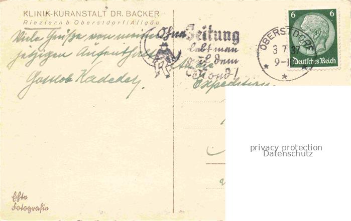 74029066 alte Postkarte Riezlern Kleinwalsertal Vorarlberg Klinik Kuranstalt Dr Backer postalisch gelaufen Erhaltung siehe scans [WerneD78] KatCode: 11390