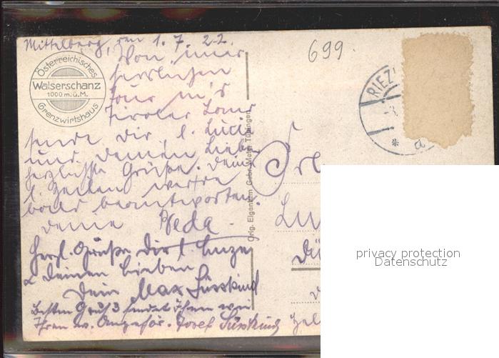 71541147 alte Postkarte Riezlern Kleinwalsertal Vorarlberg oesterreichisches Grenzwirtshaus Walserschanz postalisch gelaufen Erhaltung siehe scans KatCode: 11390