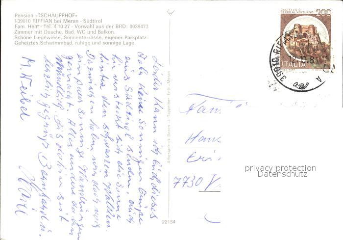 old postcard Riffian Meran Pension Tschaupphof Terrasse Schwimmbad postalisch gelaufen Erhaltung siehe scans